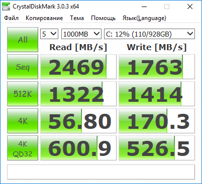 Приведем также результаты тестирования популярной утилитой CrystalDiskMark. Значения, демонстрируемые утилитой CrystalDiskMark, по скорости чтения немного ниже, что объясняется разной глубиной очереди задач.