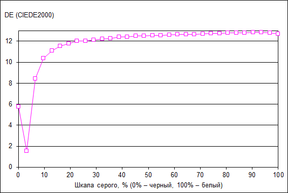 Что касается точности цветопередачи (дельта Е), то ее значение не превосходит 13, что является допустимым значением для данного класса экранов, но не очень хорошим.