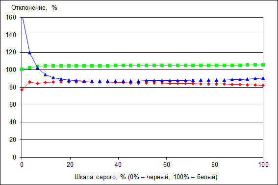 Стабильность цветовой температуры объясняется тем, что основные цвета хорошо сбалансированы по всей шкале серого.