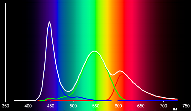 Светофильтры ЖК-матрицы не очень хорошо выделяют основные цвета. Спектры красного и зеленого цветов плохо изолированы друг от друга, да и сам спектр узковат (пик красного немного смещен влево).