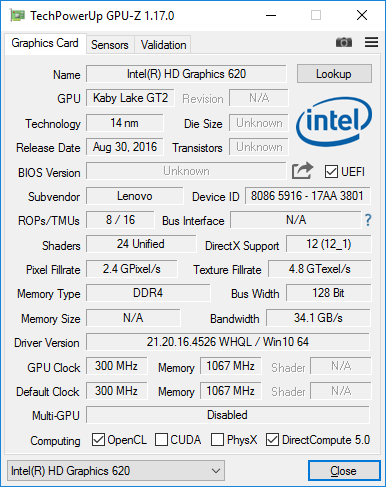 Основой ноутбука Lenovo Yoga 910-13IKB является двухъядерный процессор Intel Core i7-7500U. Он имеет номинальную тактовую частоту 2,7 ГГц, которая в режиме Turbo Boost может повышаться до 3,5 ГГц. Процессор поддерживает технологию Hyper-Threading. Размер его кэша L3 составляет 4 МБ, а расчетная максимальная мощность — 15 Вт. В этот процессор интегрировано графическое ядро Intel HD Graphics 620.