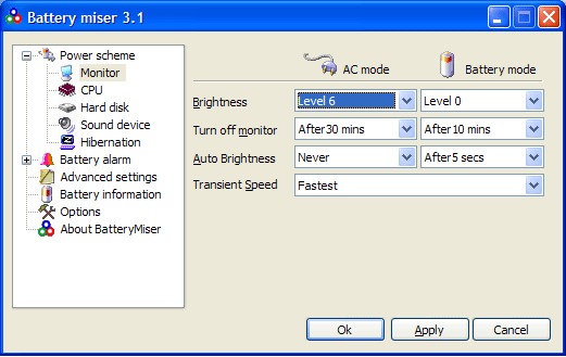 Есть и меню детальных настроек энергопотребления процессора, монитора, дисковой и звуковой подсистем. В меню настройки параметров энергопотребления монитора меня заинтересовала функция «Auto Brightness». При ее активизации по прошествии заданного промежутка времени с момента последнего действия пользователя яркость монитора плавно уменьшается до минимума. При этом отключения монитора не происходит. Как эта функция влияет на время автономной работы, увидим ниже.