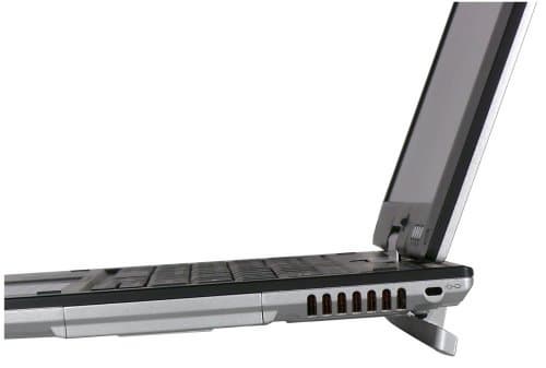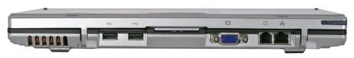 Сзади слева находится еще одна решетка вентиляции процессора, еще два порта USB, видеовыход (DSUB) плюс сетевой и модемный интерфейсы. Также во всей красе видно планку-подставку на задней крышке (серая полоска справа в ней — это стилус в гнезде). Здесь следует указать на небольшую особенность — планку надо установить в желаемое положение (поднять или опустить) до того, как вы будете вставлять сетевые интерфейсы — по очевидным причинам.