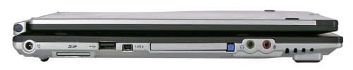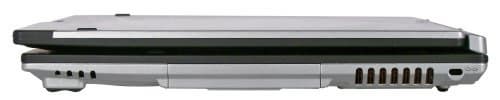Зато с левой стороны разъемов — хоть отбавляй. Там расположен разъем для штекера питания (так провод не слишком заметен, хорошее решение), картовод SD, один порт USB (опять же, удобно для подключения флешдрайвов и пр.), порт IEEE1394 (без питания), разъем PCMCIA (закрыт заглушкой) и вывод на наушники и микрофонный вход. Обратите внимание на еще одну вентиляционную решетку под передней крышкой, по замыслу авторов, этот канал должен отводить тепло от подставок под руки, чтобы они оставались холодными. Не скажу, что это совсем получилось, но перегрева я тоже не ощущал.