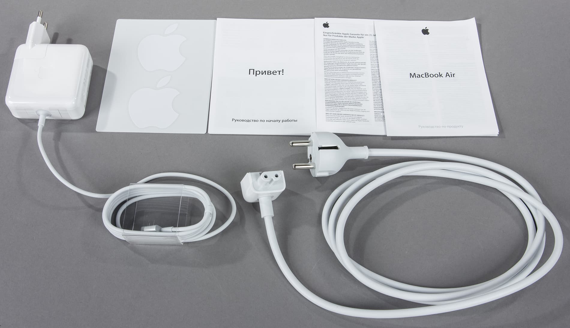 Внутри упаковочной коробки, кроме самого ноутбука, имеется зарядное устройство MagSafe 2 (45 Вт), удлинитель для зарядного устройства, два буклета с инструкциями по эксплуатации и, конечно же, наклейки Apple. То есть в комплектацию входит только все самое необходимое, без дополнительных бонусов.