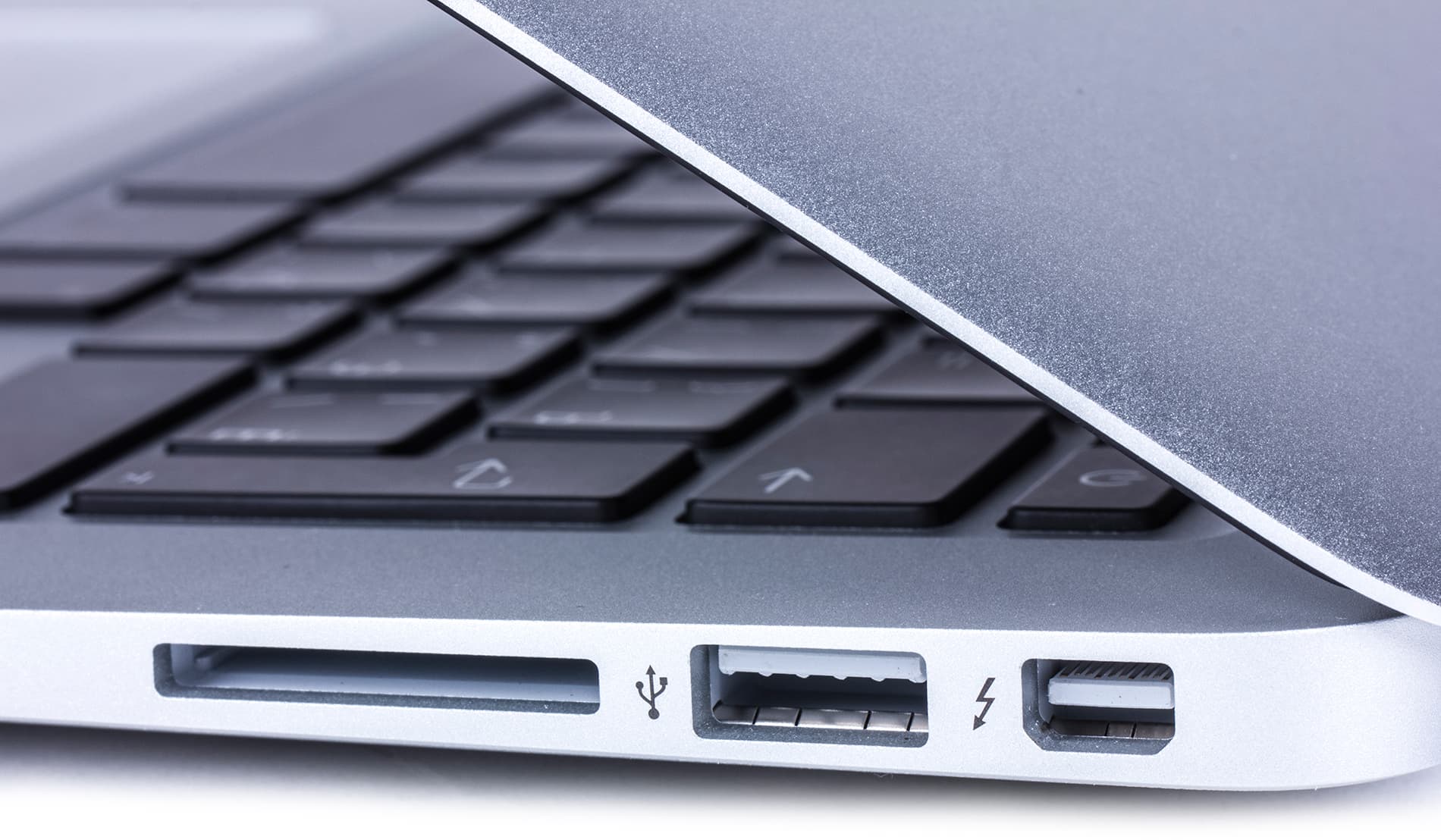 Что касается разъемов в новых моделях MacBook Air, то и они не изменились в сравнении с моделями 2013 года. Имеется два порта USB 3.0 (один слева, а другой справа), традиционный для Apple порт Thunderbolt, совмещенный порт для микрофона/наушников/гарнитуры Apple и картовод для SDXC-карт памяти.