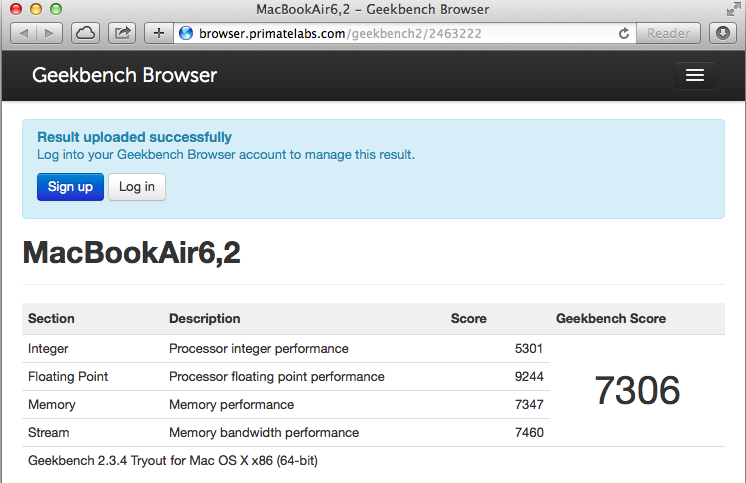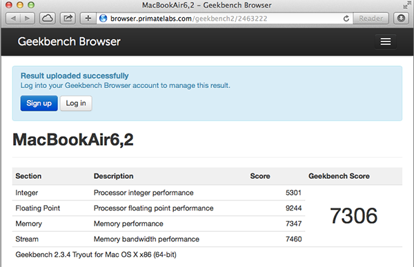Дабы иметь возможность сравнить результаты тестирования 13-дюймового ноутбука MacBook Air прошлого года (Mid 2013) на процессоре Intel Core i5-4250U c результатами тестирования нашего ноутбука MacBook Air (Early 2014), мы также воспользовались предыдущей версией бенчмарка Geekbench (версией 2.3.4), для которой у нас были результаты тестирования ноутбука MacBook Air (Mid 2013).