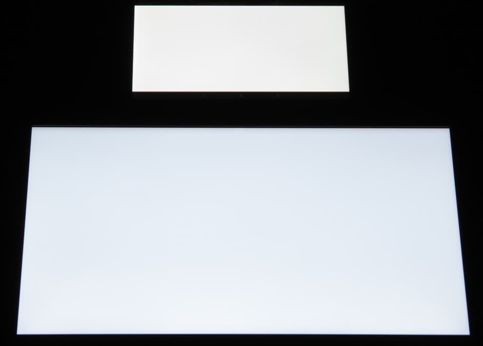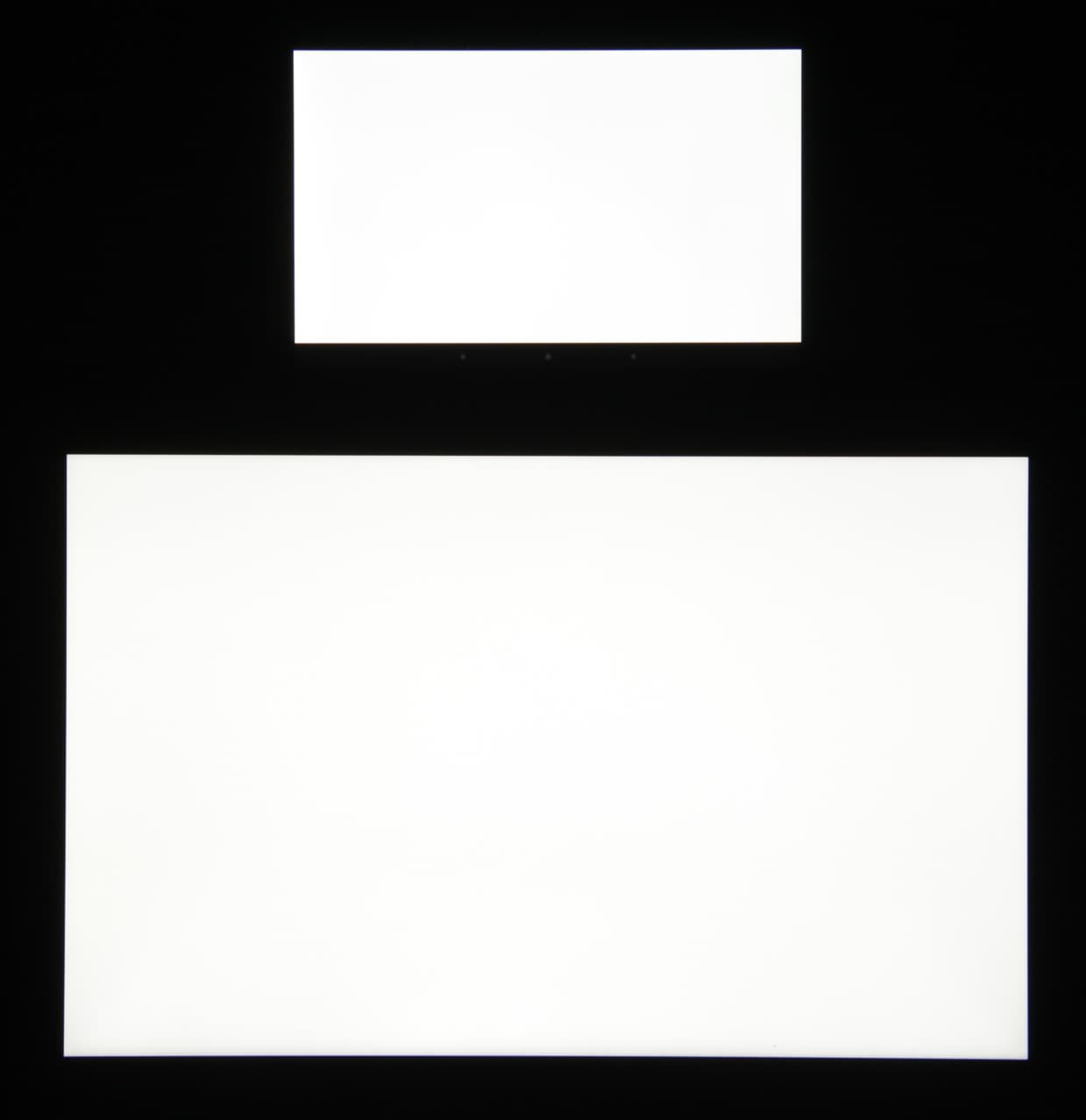 Из-за разницы в цветовом тоне и цвете рамок сложно визуально оценить, какой экран темнее, но яркость, определенная по фотографии, показывает однозначную победу MacBook Air — 45 против 91 у Nexus 7 (средняя яркость по шкале серого 0—255). Отметим, что в этом тесте MacBook Air был включен, но подсветка его экрана была выключена. Связано это с тем, что включенный экран MacBook Air обладает лучшими антибликовыми свойствами, чем выключенный. С практической точки зрения антибликовые свойства экрана настолько хороши, что даже прямое отражение ярких источников света не сильно мешает работе. Никакого существенного двоения отраженных в экране объектов мы не обнаружили, то есть воздушного промежутка в слоях экрана нет, что, впрочем, ожидаемо для ЖК-экрана без сенсорного слоя и/или защитного стекла.