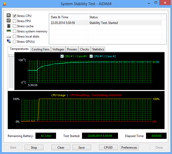При загрузке процессора тестом Stress CPU (утилитой AIDA64 Extreme Edition — тест на стабильность системы), который использует целочисленные вычисления, частота процессора составляет 2,4 ГГц. Температура процессора в этом режиме загрузки увеличивается до 92 °C, то есть фактически достигает своего предельного значения.