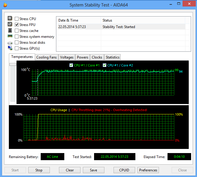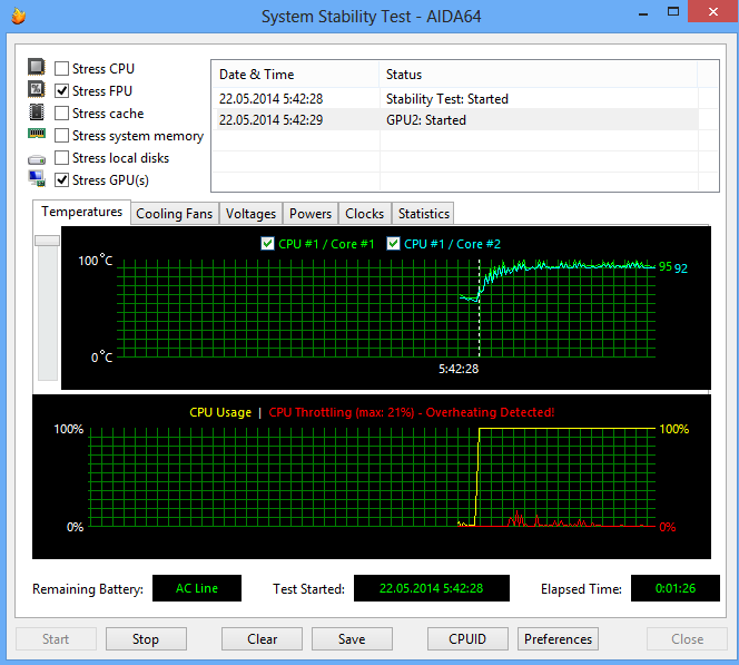 В режиме одновременной загрузки и ядер процессора (Stress FPU), и графического ядра (Stress GPU), ядра процессора работают на частоте 1,4 ГГц и также наблюдается режим троттлинга..