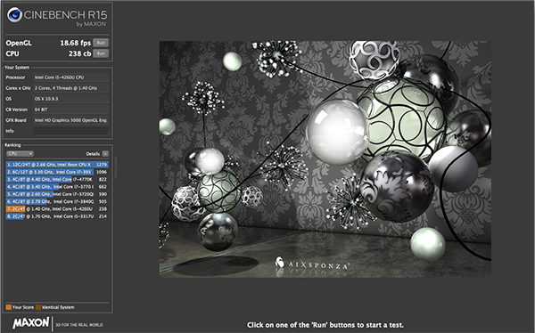 Следующий бенчмарк — синтетический тест рендеринга Cinebench R15 компании Maxon. Рендеринг может производится как средствами CPU, так и средствами GPU (OpenGL).