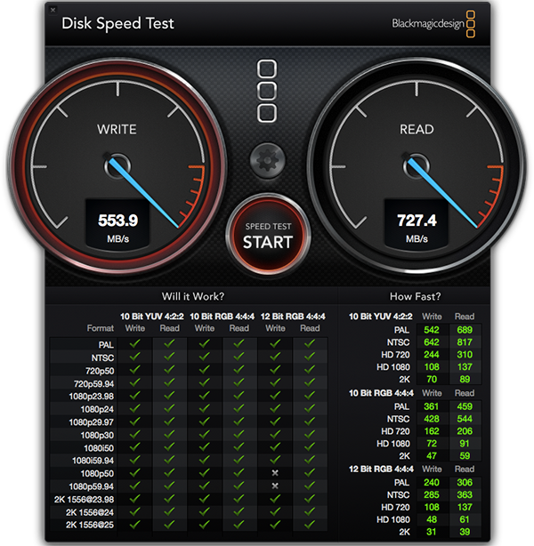 Последний тест — Blackmagic Disk Speed Test, измеряющий производительность накопителя. Результаты этого теста впечатляют: у 13-дюймового ноутбука MacBook Air (Early 2014) c SSD-накопителем Apple SSD SD0256F (256 ГБ) скорость чтения составляет 727,4 МБ/с, а скорость записи — 554 МБ/с.
