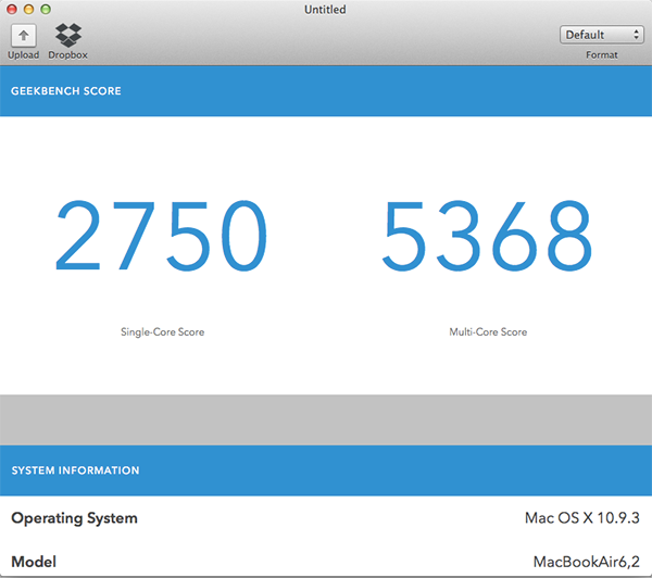 В тесте Geekbench 3, измеряющем производительность процессора и оперативной памяти, 13-дюмовый ноутбук MacBook Air (Early 2014) получил 5368 баллов в двухъядерном режиме и 2750 баллов в одноядерном режиме.