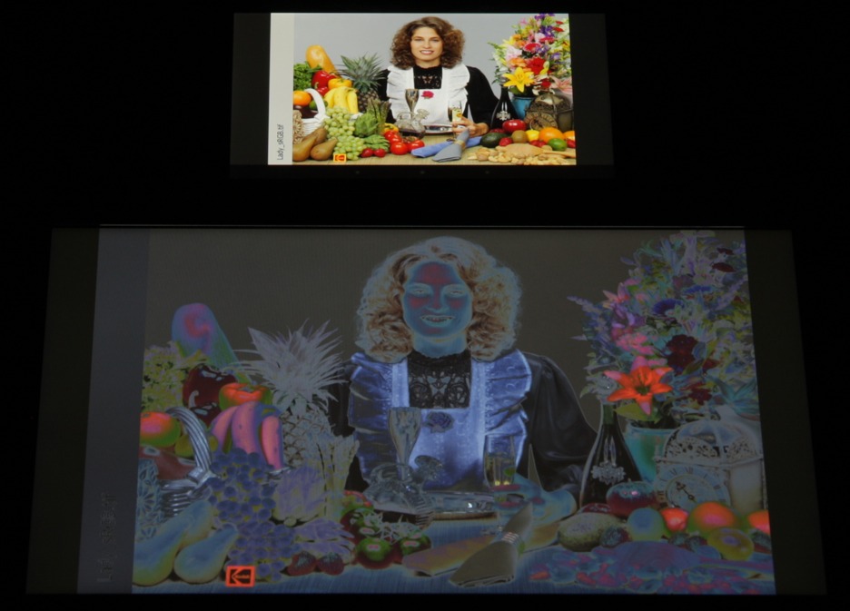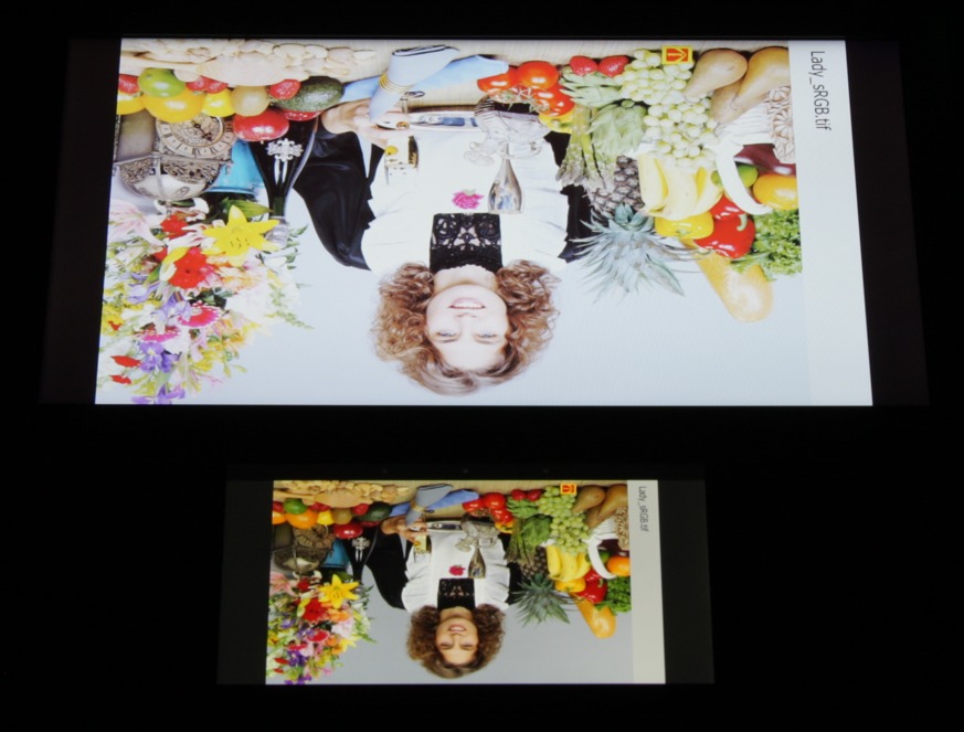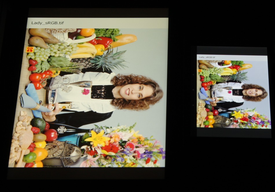 В MacBook Air используется ЖК-матрица типа TN, поэтому экран имеет хорошие углы обзора без инвертирования оттенков и без большого сдвига цветов при отклонении взгляда по горизонтали, но при отклонении взгляда вниз инвертируются темные оттенки, при отклонении вверх — светлые. Для сравнения приведем фотографии, на которых на экраны Nexus 7 и тестируемого устройства выведены одинаковые изображения, при этом яркость обоих экранов установлена примерно на 200 кд/м², а цветовой баланс на фотоаппарате принудительно переключен на 6500 К. Перпендикулярно к экранам тестовая картинка: