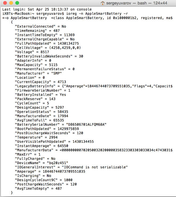 Остается добавить, что ноутбук оснащен встроенной веб-камерой 480р, расположенной над экраном, а также несъемной аккумуляторной батареей емкостью 41,4 Вт·ч. Ниже представлена информация с контроллера аккумулятора, полученная с помощью Терминала при вводе команды ioreg -n AppleSmartBattery -r