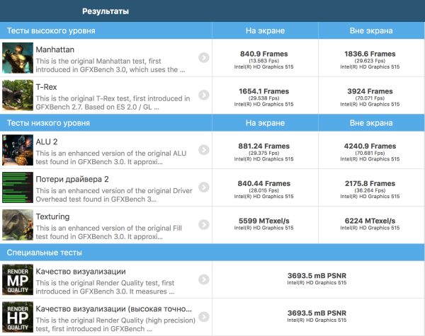 | GFX Benchmark 3 | MacBook Retina 12″ (Early 2016, младшая конфигурация) | MacBook Retina 12″ (Early 2015, младшая конфигурация) |