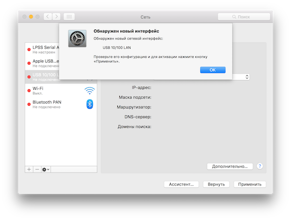 Кстати, этим же Apple объясняет, почему не были выпущены такие аксессуары, как, например, переходник с USB Type C на Ethernet: мол, если вам нужно, то купите сторонний. И здесь нам на помощь приходят китайцы. Мы купили такой переходник и опробовали вместе с новым MacBook. Все работает, и скорость действительно выше, чем по Wi-Fi. Правда, после подключения переходника надо зайти в Системные настройки / Сеть, выбрать в списке слева коннектор и нажать «Применить».