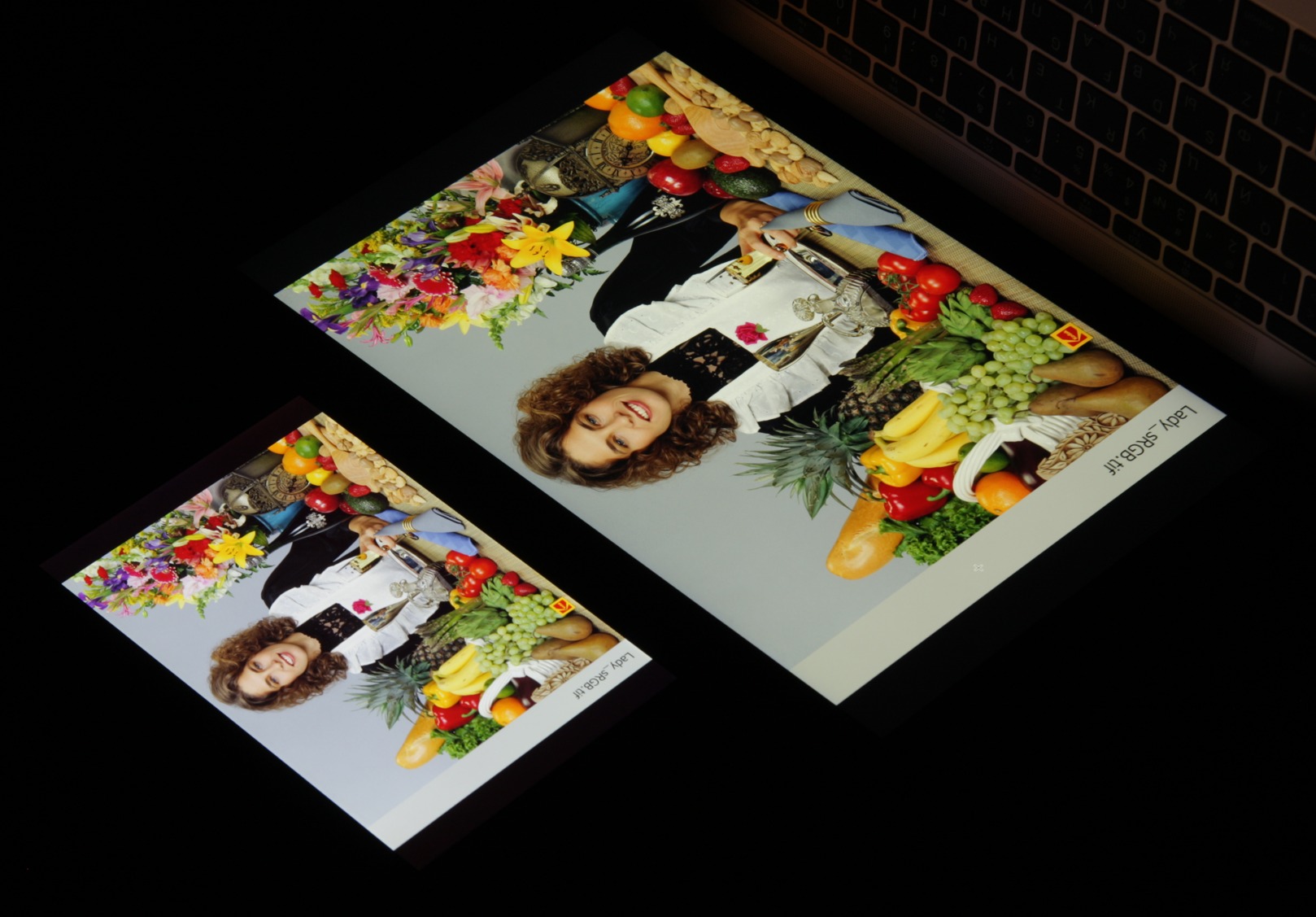 Цветопередача хорошая и цвета насыщенные у обоих экранов, цветовой баланс различается несущественно, но картинка у MacBook чуть-чуть затемнена. Теперь под углом примерно 45 градусов к плоскости и к стороне экрана: