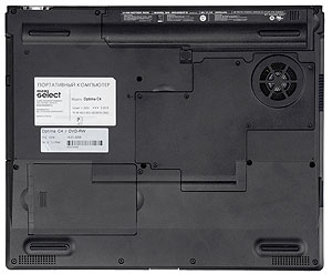 Снизу решетки динамиков, большая крышка блока процессора, модулей памяти и плат mini PCI с вентиляционной решеткой и сдвижная крышка отсека жесткого диска.