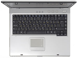 Фиксатор крышки освобождается нажатием на кнопку. В открытом виде ноутбук также выглядит весьма достойно. Серебристая рабоча поверхность, вставка с рифлением "под ткань" над клавиатурой, элегантный тачпад, очень напоминающий последние модели ноутбуков от ASUS. В общем, ноутбук смотрится гораздо дороже, чем стоит.