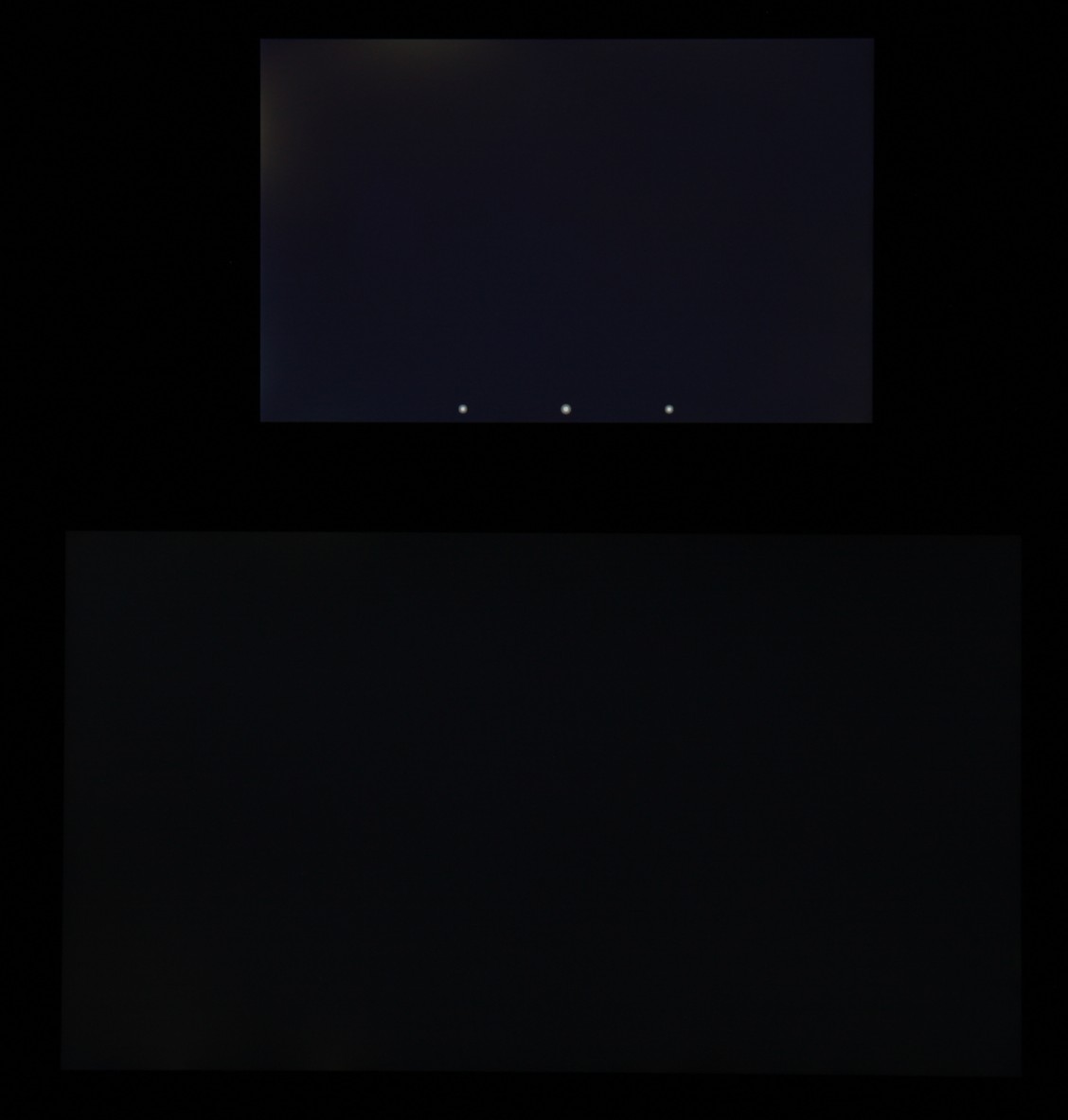 Яркость под углом у обоих планшетов заметно уменьшилась (как минимум в 4 раза, исходя из разницы в выдержке), но в случае Surface Pro 2 падение яркости меньше (яркость по фотографиям 241 против 225 у Nexus 7). При этом цветовой тон изменился несильно. Черное поле при отклонении по диагонали высветляется сильно и приобретает фиолетовый или красно-фиолетовый оттенок. Фотографии ниже это демонстрируют (яркость белых участков в перпендикулярной плоскости экранов направлении у экранов одинаковая!):