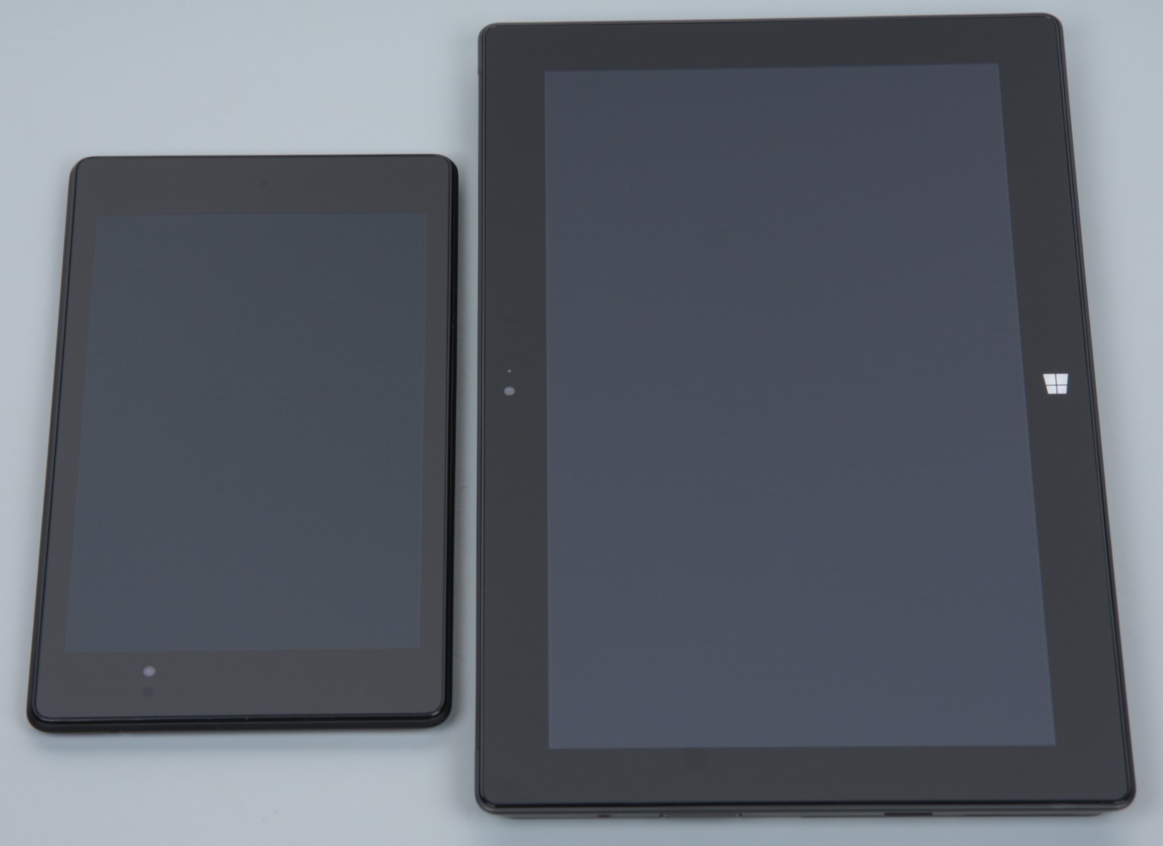Лицевая поверхность экрана выполнена в виде стеклянной пластины с зеркально-гладкой поверхностью, устойчивой к появлению царапин. Судя по отражению объектов, имеется очень эффективный антибликовый фильтр, по снижению яркости отражения примерно равный фильтру экрана Google Nexus 7 (2013) (далее просто Nexus 7). Для наглядности приведем фотографии, на которых в выключенных экранах обоих планшетов отражается белая поверхность (Microsoft Surface Pro 2, как не трудно определить, — справа, далее их можно различать по размеру):