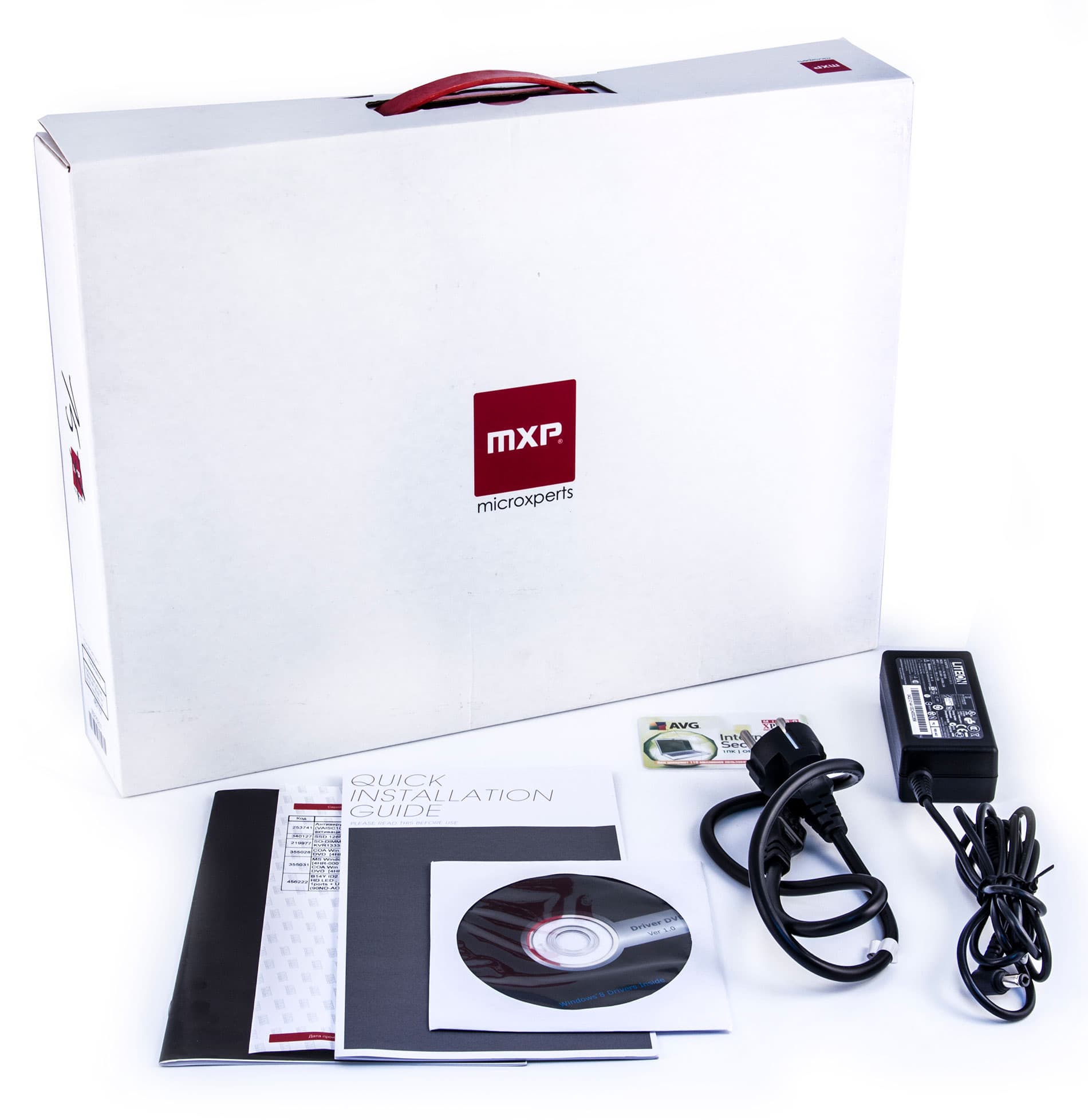 Комплектация этого ультрабука минимальна. Кроме простенькой картонной коробки с логотипом MXP в комплект поставки входит DVD-диск с драйверами под Windows 8, бесполезное руководство пользователя не от той модели ультрабука, гарантийный талон, ключ доступа к антивирусу AVG сроком на один год и, конечно же, неотъемлемая часть любого ноутбука — адаптер питания. Повторим, что в этом ультрабуке нет оптического привода, так что наличие DVD-диска с драйверами выглядит весьма странно. То есть если возникнет необходимость в установке драйверов, придется либо использовать ноутбук или настольный ПК с оптическим приводом (для того чтобы перенести на флэшку содержимое DVD-диска), либо приобрести внешний USB-привод для DVD-дисков.