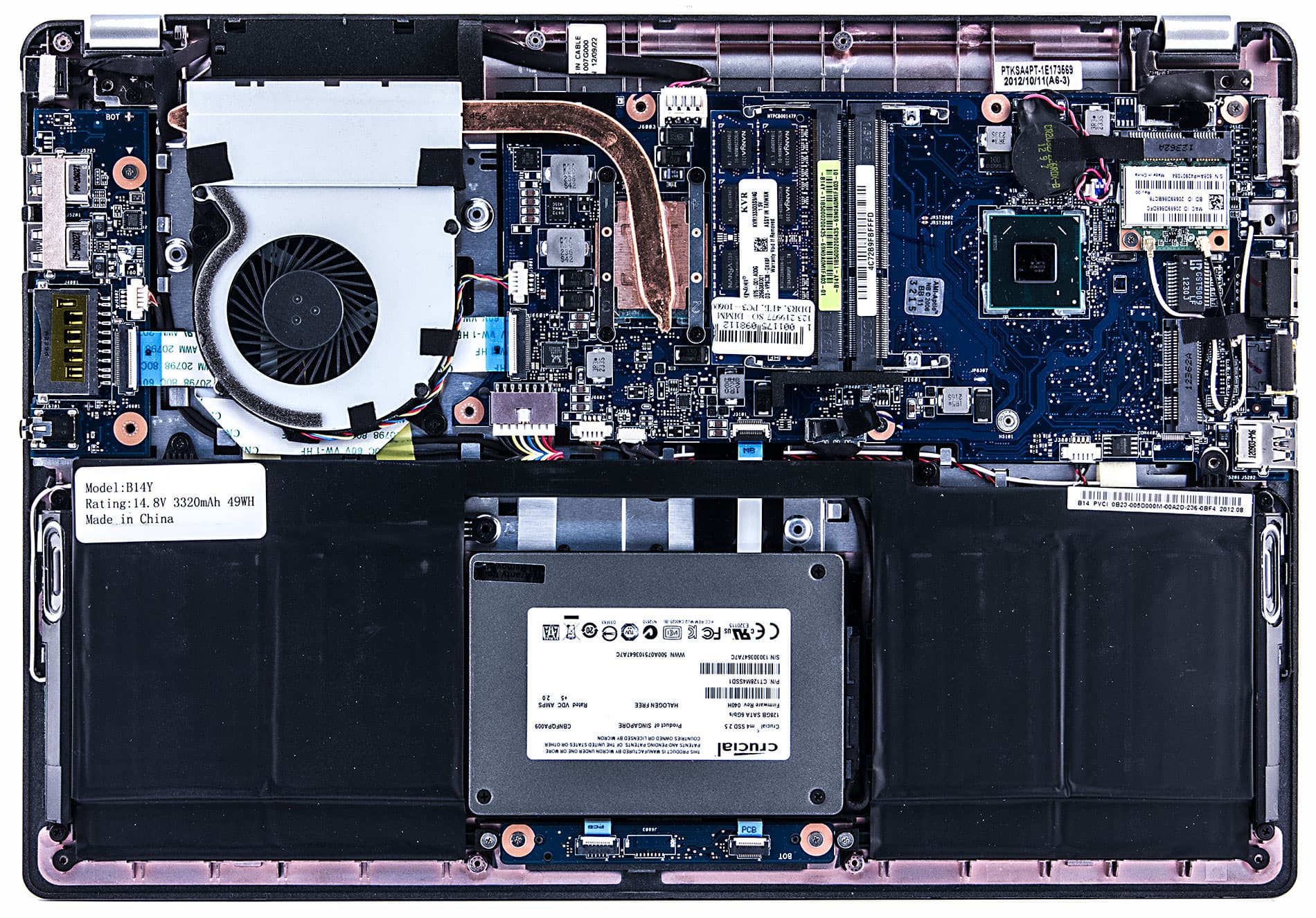 Батарея крепится на специальное пластмассовое основание, которое служит дополнительным креплением для накопителя ультрабука и ребром жесткости для батареи. В этой модели установлена многоэлементная батарея с паспортной емкостью 49 800 мВт·ч.