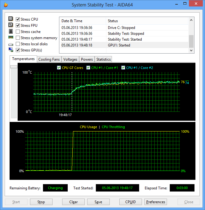 В тесте утилиты AIDA64 на стабильность нам не удалось нагреть процессор до температуры выше 75 °С в стрессовом режиме его загрузки, что является абсолютно нормальным результатом. То есть система охлаждения процессора работает именно так, как и должна. Причем при загрузке процессора одновременно с графическим ядром устоявшаяся температура и процессора, и графического ядра также составляла 75 °С. Тем не менее, ядра процессора при этом работали на частоте 1,9 ГГц, а не 2,4 ГГц.