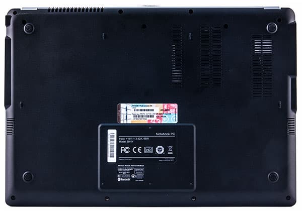 Нижняя часть корпуса выполнена из черного пластика стандарта PC+ABS-FR(40). Пластик PC+ABS применяется в большинстве ноутбуков и ультрабуков, а индекс FR(40) указывает, что он имеет добавочные компоненты для защиты от возгорания.