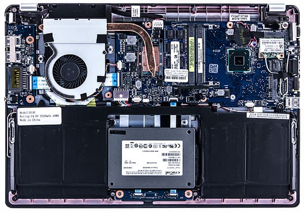 Для разборки ультрабука необходимо открепить, отсоединить и снять клавиатуру, которая крепится с помощью четырех защелок, расположенных в верхней и боковых частях утопленной поверхности. Затем необходимо открутить все винты, которые находятся под клавиатурой. Потом следует перевернуть ультрабук, открутить все винты с его основания и снять крышку-основание. Сняв крышку, можно получить доступ ко всем наиболее важным компонентам ультрабука — системе охлаждения, SSD-накопителю, памяти и модулю Wi-Fi.
