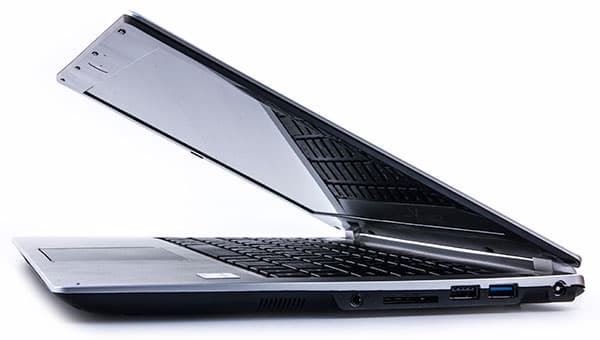 На левом торце расположены видеовыход VGA, порт USB 3.0, разъем HDMI и розетка RJ-45, а также отверстие для установки кенсингтонского замка. На правом торце находятся еще один порт USB 3.0, порт USB 2.0, слот для SD/MMC-карт, универсальный аудиоразъем (миниджек) и разъем питания. В качестве критики заметим, что видеовыход VGA уже морально устарел и вместо него хотелось бы видеть разъем DisplayPort или DVI. Ну и кроме того, оптимальное место для размещения видеоразъемов — это задний торец корпуса, а не боковой.