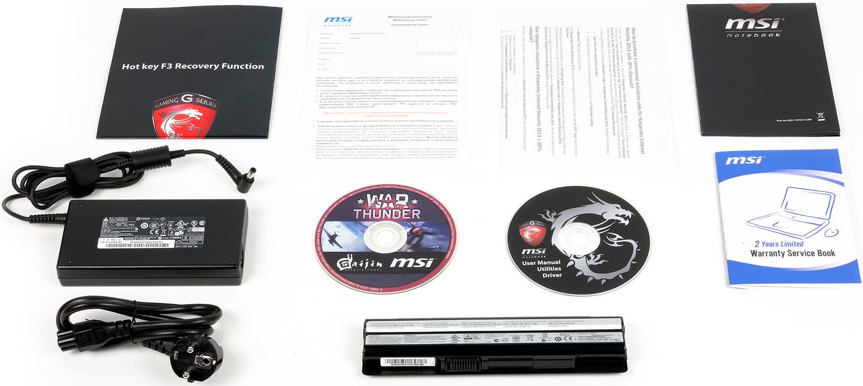 Кроме самого ноутбука в комплект поставки входит краткое руководство пользователя, DVD-диск с драйверами и утилитами, бонусный DVD-диск с клиентом игры War Thunder (эта онлайн-игра и так бесплатная), матерчатый чехол для ноутбука и, конечно же, адаптер питания на 120 Вт (19,5 В; 6,15 А).