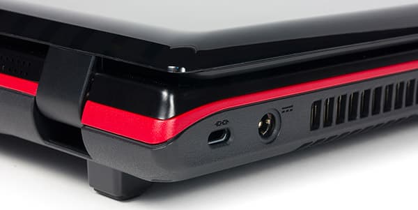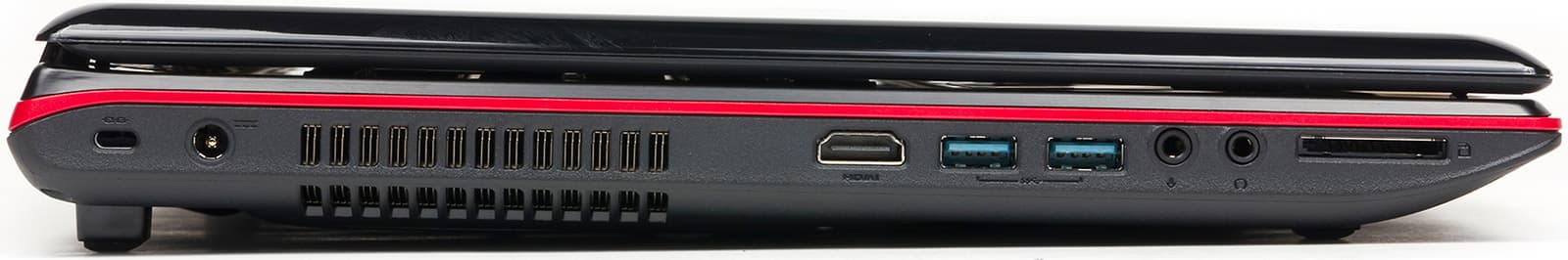 На левом торце корпуса ноутбука расположены два порта USB 3.0, разъем HDMI, два аудиоразъема типа миниджек (наушники, микрофон), слот для SD-карт памяти, разъем питания и отверстие кенсингтонского замка.