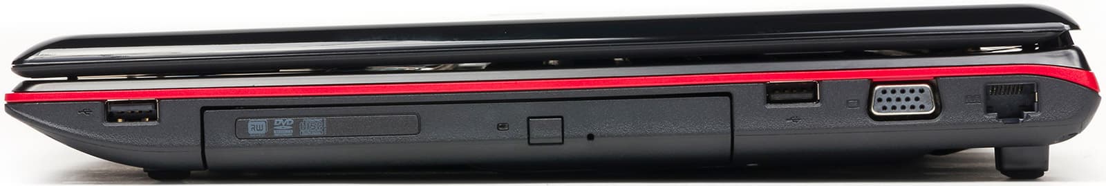 На правом торце имеются два порта USB 2.0, разъем RJ-45, разъем VGA (D-Sub) и лоток оптического привода.