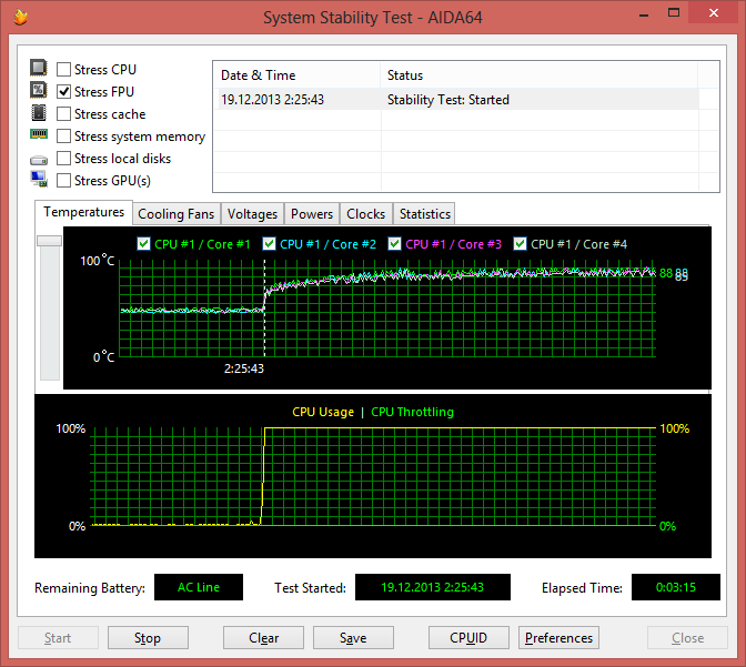 При загрузке процессора тестом Stress CPU (утилитой AIDA64 Extreme Edition — тест на стабильность системы), который использует целочисленные вычисления, частота процессора составляет 3,2 ГГц (напомним, что для процессора Intel Core i7-4700QM максимальная частота в режиме Turbo Boost составляет 3,4 ГГц). Температура процессора в этом режиме загрузки не превосходит 80 °С.