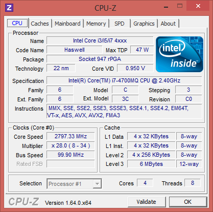 Итак, основой нашего ноутбука MSI GE70 2OD является четырехъядерный процессор Intel Core i7-4700MQ. Этот процессор имеет номинальную тактовую частоту 2,4 ГГц, которая в режиме Turbo Boost может повышаться до 3,4 ГГц. Размер кэша L3 составляет 6 МБ, а TDP — 47 Вт. В этот процессор интегрировано графическое ядро Intel HD Graphics 4600, базовая частота которого составляет 400 МГц, а частота в режиме Turbo Boost — 1,15 ГГц.