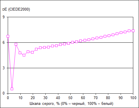 Что касается точности цветопередачи (дельта Е), то ее значение не превосходит 8, что является допустимым результатом для данного класса экранов.
