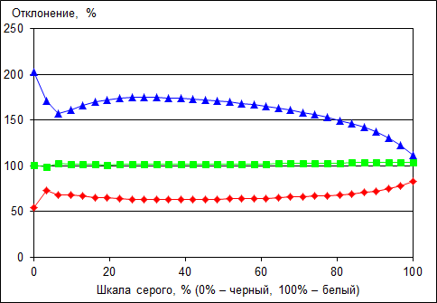 Завышенная цветовая температура объясняется тем, что доля красного цвета немного занижена по всей шкале серого, а доля синего, наоборот, завышена.