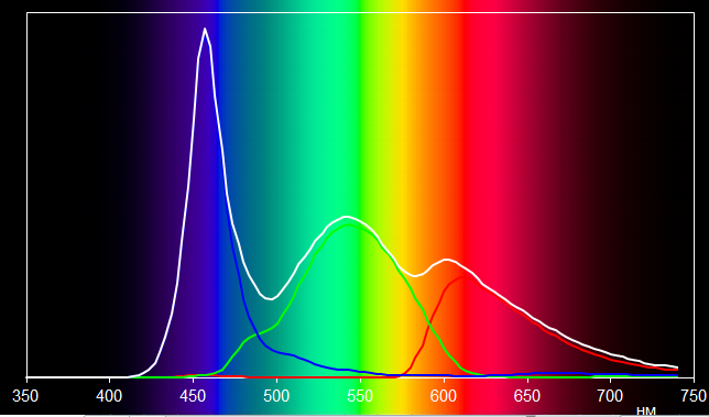 Светофильтры ЖК-матрицы немного подмешивают компоненты друг к другу. Так, в спектр красного цвета подмешивается зеленый цвет, а вот спектр синего цвета хорошо изолирован. Такая ситуация вполне типична для ЖК-матриц, используемых в ноутбуках.