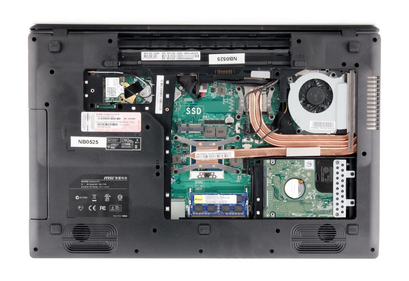 В GE70 два слота для оперативной памяти. В нашей конфигурации установлен один модуль, что позволяет легко нарастить объем памяти (иногда ставят 2 × 2 ГБ, тогда приходится менять оба модуля). В левом верхнем углу находится беспроводная карта (тоже легко меняется), в правом нижнем — жесткий диск.