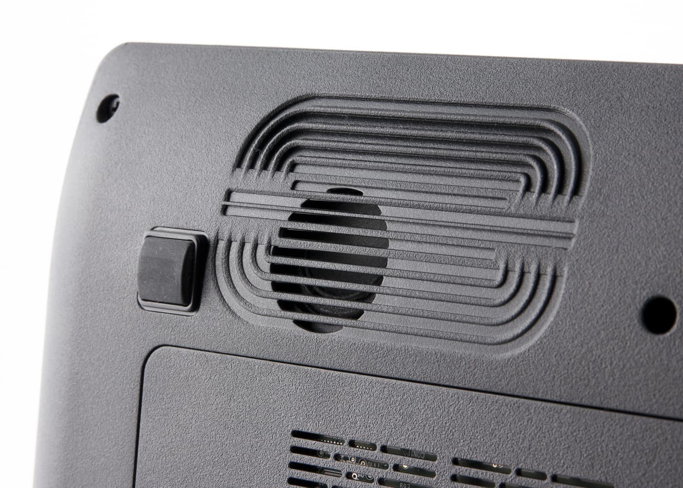 Переходим к боковым граням корпуса и расположенным на них портам расширения. Спереди никаких разъемов нет, грань плавно закругляется, и на ней расположены динамики.