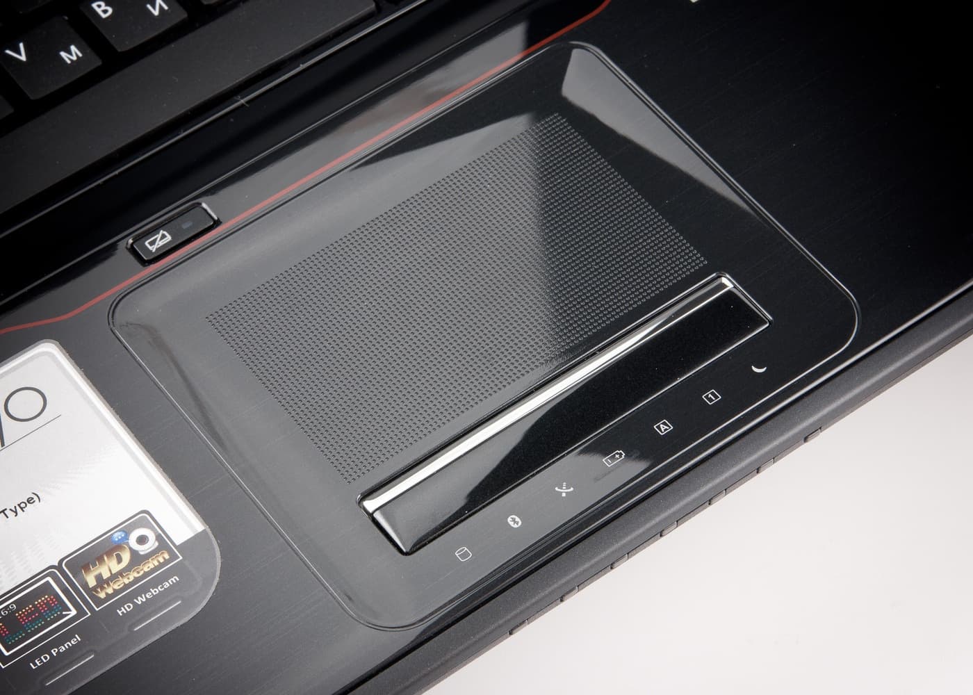 Индикаторы здесь, как и во всех остальных моделях в последнее время, расположены на передней грани и смотрят вперед. При этом иконки индикаторов нанесены на клавиатурной панели под тачпадом (их видно на предыдущей фотографии). Индикаторов много, аж семь штук. Перечислять их функциональность я не буду, все прекрасно видно на фотографии, лучше посмотрим на дополнительные клавиши.