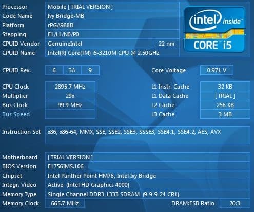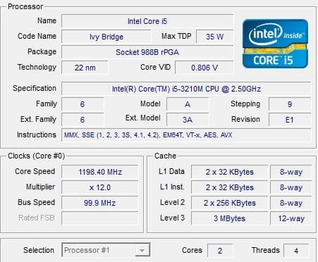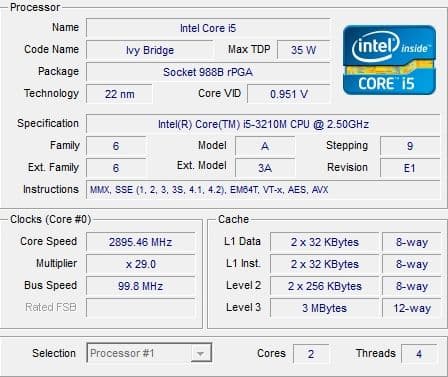 | Процессор | Mobile DualCore Intel Core i5-3210M, 2900 МГц (29×100) |