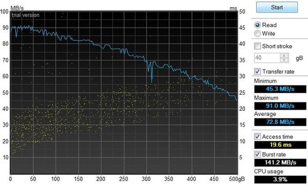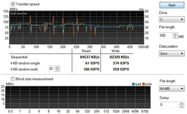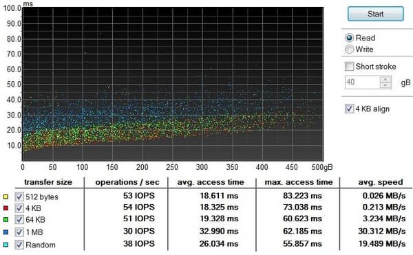 Показатели линейной скорости весьма скромные, время доступа тоже большое по современным меркам. Кстати, еще до снятия этого теста мне казалось, что GE70 загружается как-то не очень быстро.