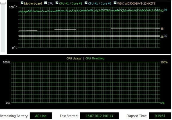 Однако немного смущает, что даже на столь высоком уровне она по чуть-чуть продолжает расти вверх — к концу теста процессор прогрелся аж до 92 градусов.