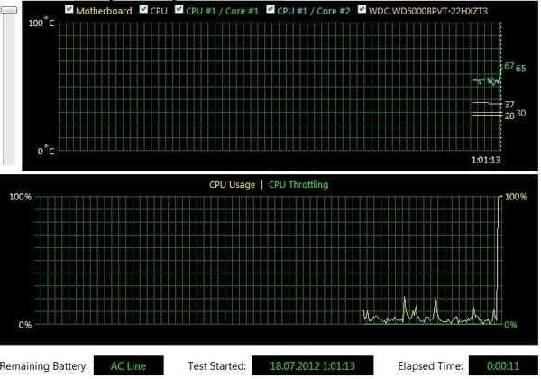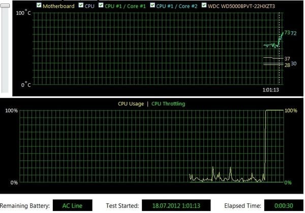 За 30 секунд она достигает всего 73 градусов, да и график роста достаточно плавный. Значит, система охлаждения обладает большой инерционностью и, в принципе, хорошо справляется со своими обязанностями. Впрочем, в данном случае все довольно логично — она наверняка рассчитана под гораздо более «горячие» Core i7 (которые, к тому же, имеют еще и более высокую частоту), так что скромный Core i5 даже на максимуме своих возможностей прогреть ее не в состоянии.