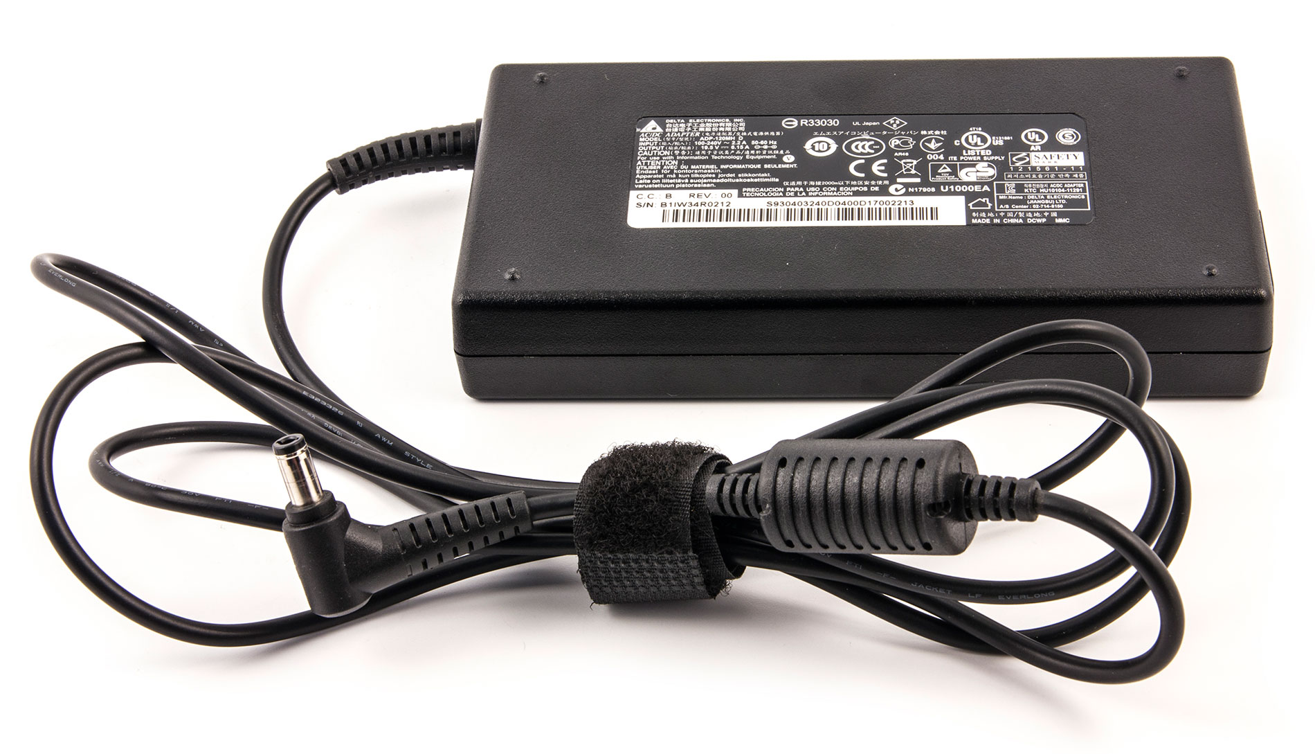Адаптер питания стандартный (для ноутбуков MSI). Его мощность составляет 120 Вт (19,5 В; 6,15 А).