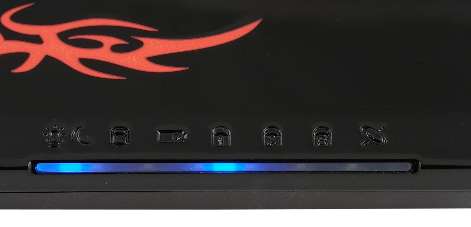 Если открыть крышку, это впечатление не пропадает. На клавиатурной панели нанесены такие же рисунки, что и на верхней крышке, "доработана" и панель над клавиатурой. Решетки, прикрывающие динамики, сделаны под «жабры» на автомобилях и также покрашены в красный цвет. А панель, на которой расположены дополнительные кнопки, сделана «под алюминий с насечкой». Описать это сложно, но вид достаточно интересный. Вокруг кнопок сделана красная окантовка.