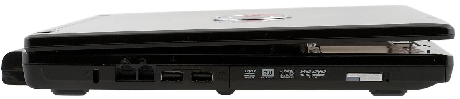 На левом боку расположен оптический привод, два порта USB, модемный и сетевой порты, разъем замка Кенсингтона. Лампочка активности привода выполнена на кнопке выброса. Сама кнопка большая, нащупать ее достаточно легко.